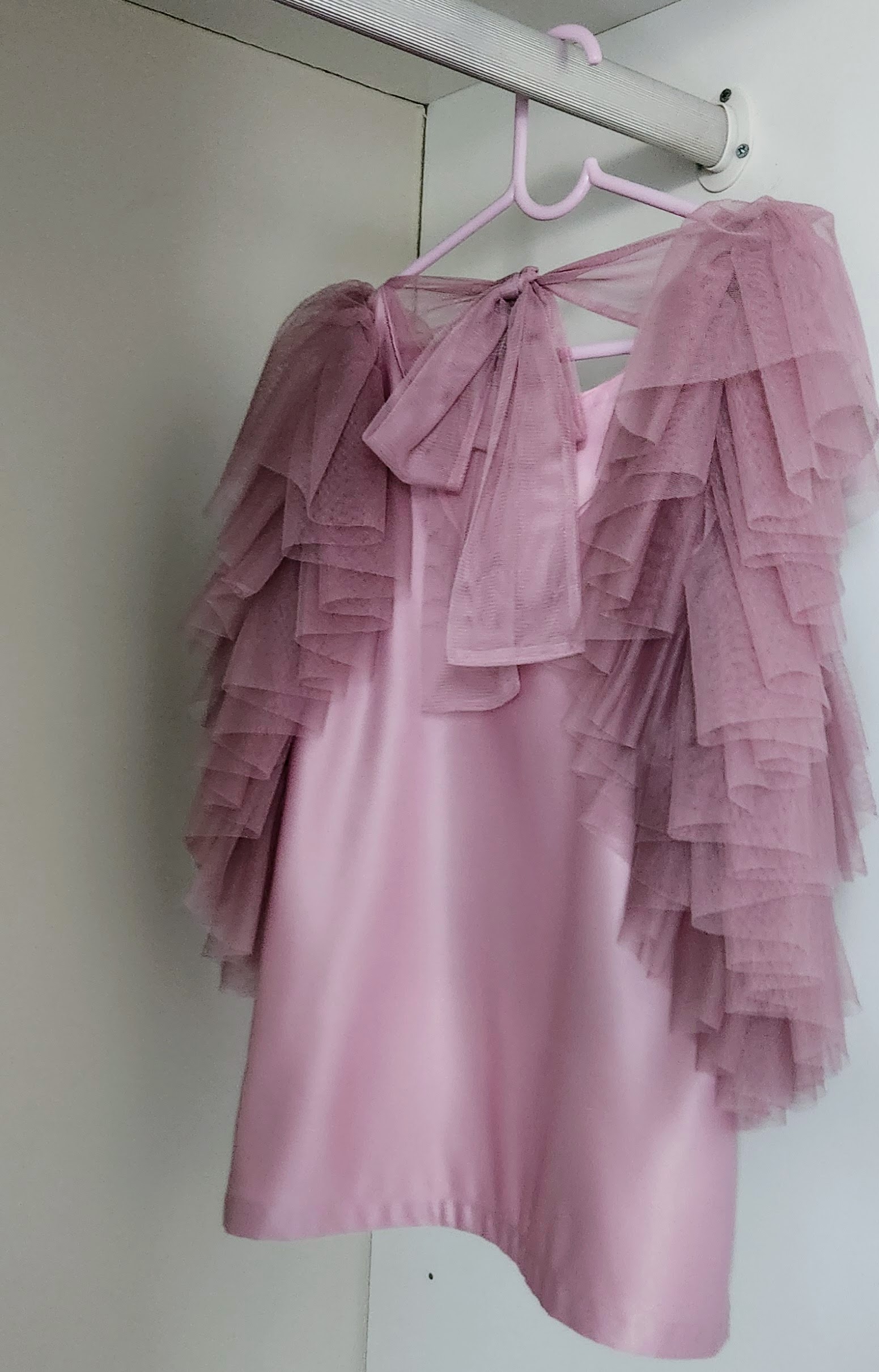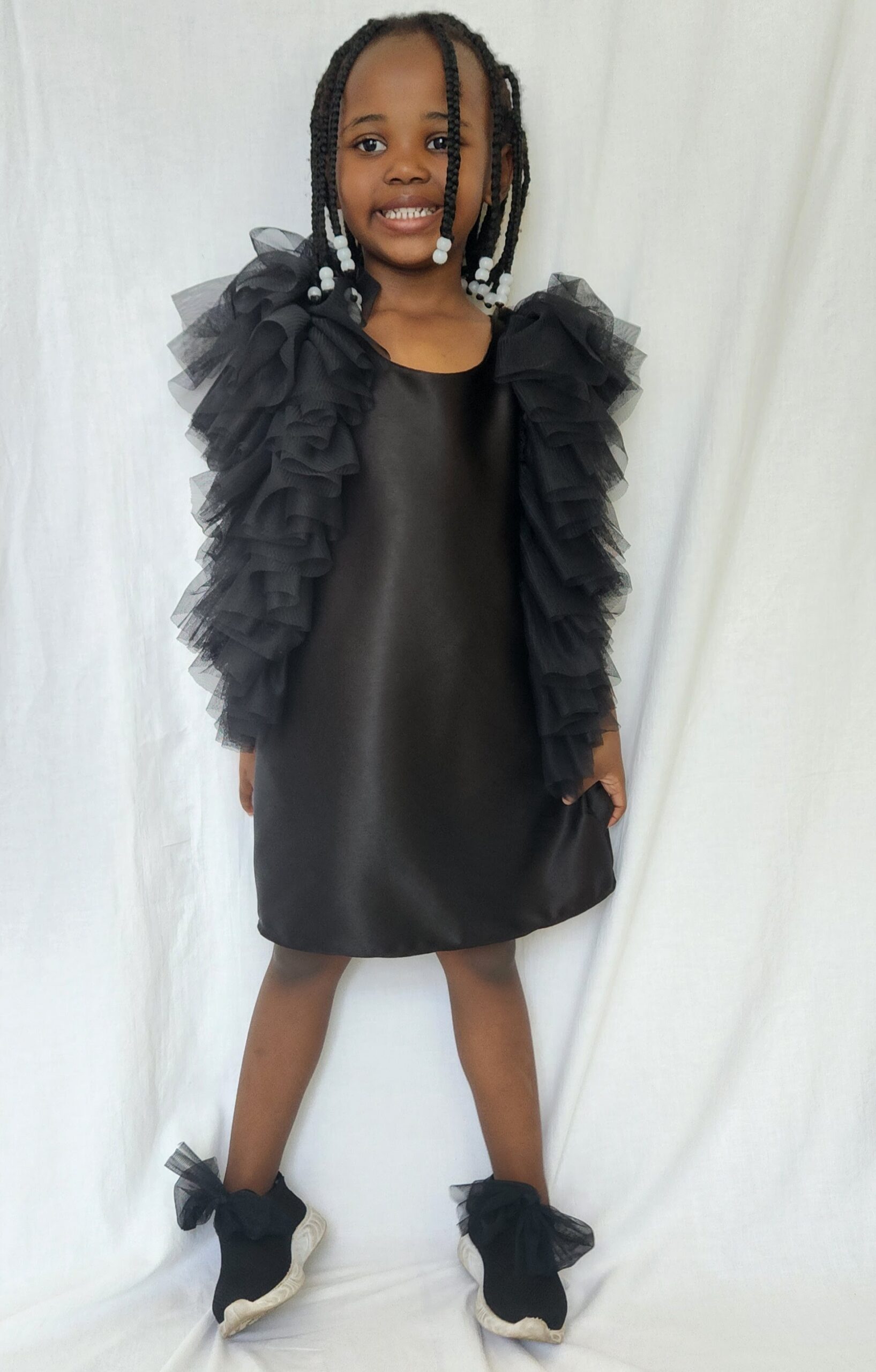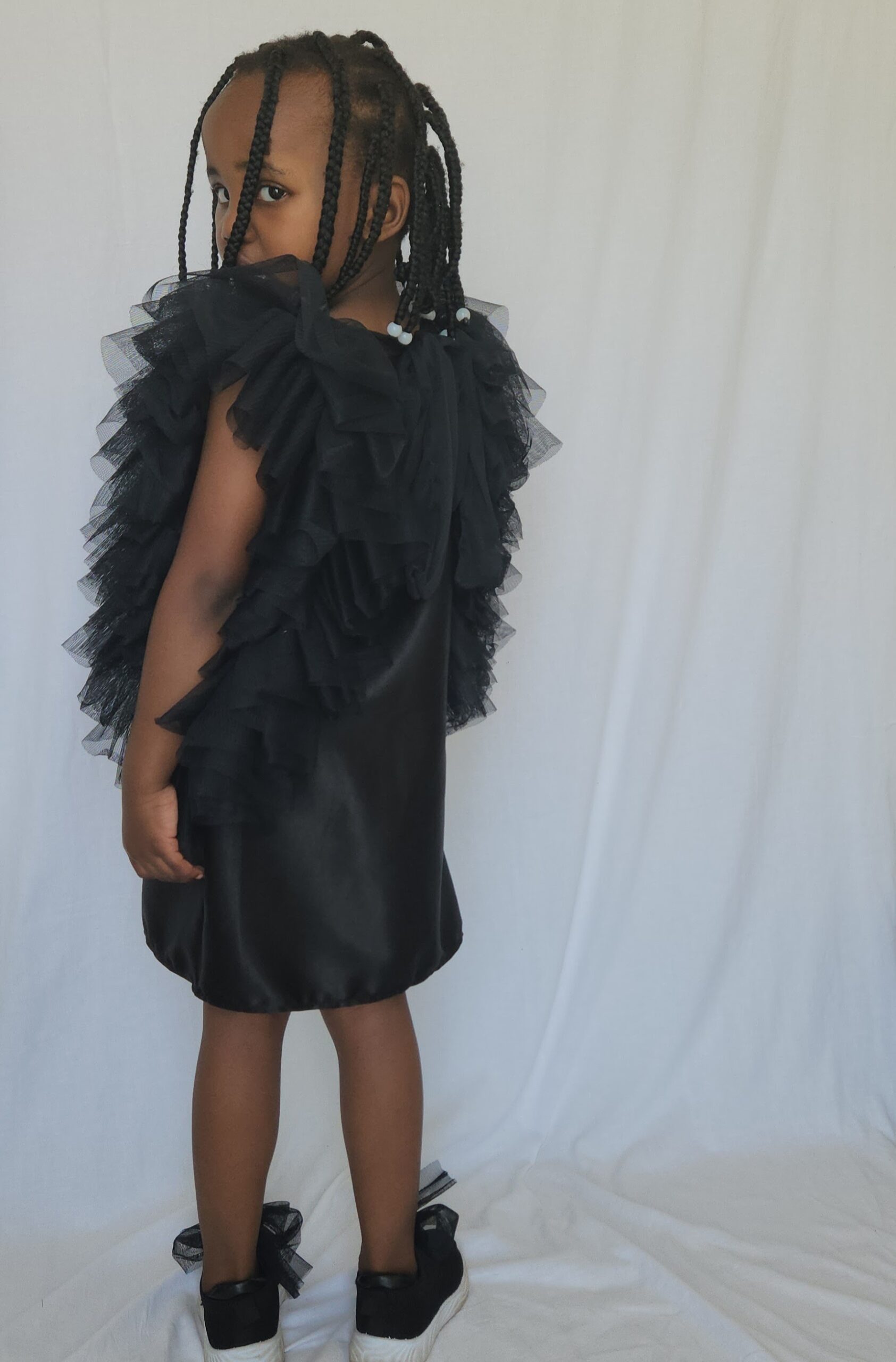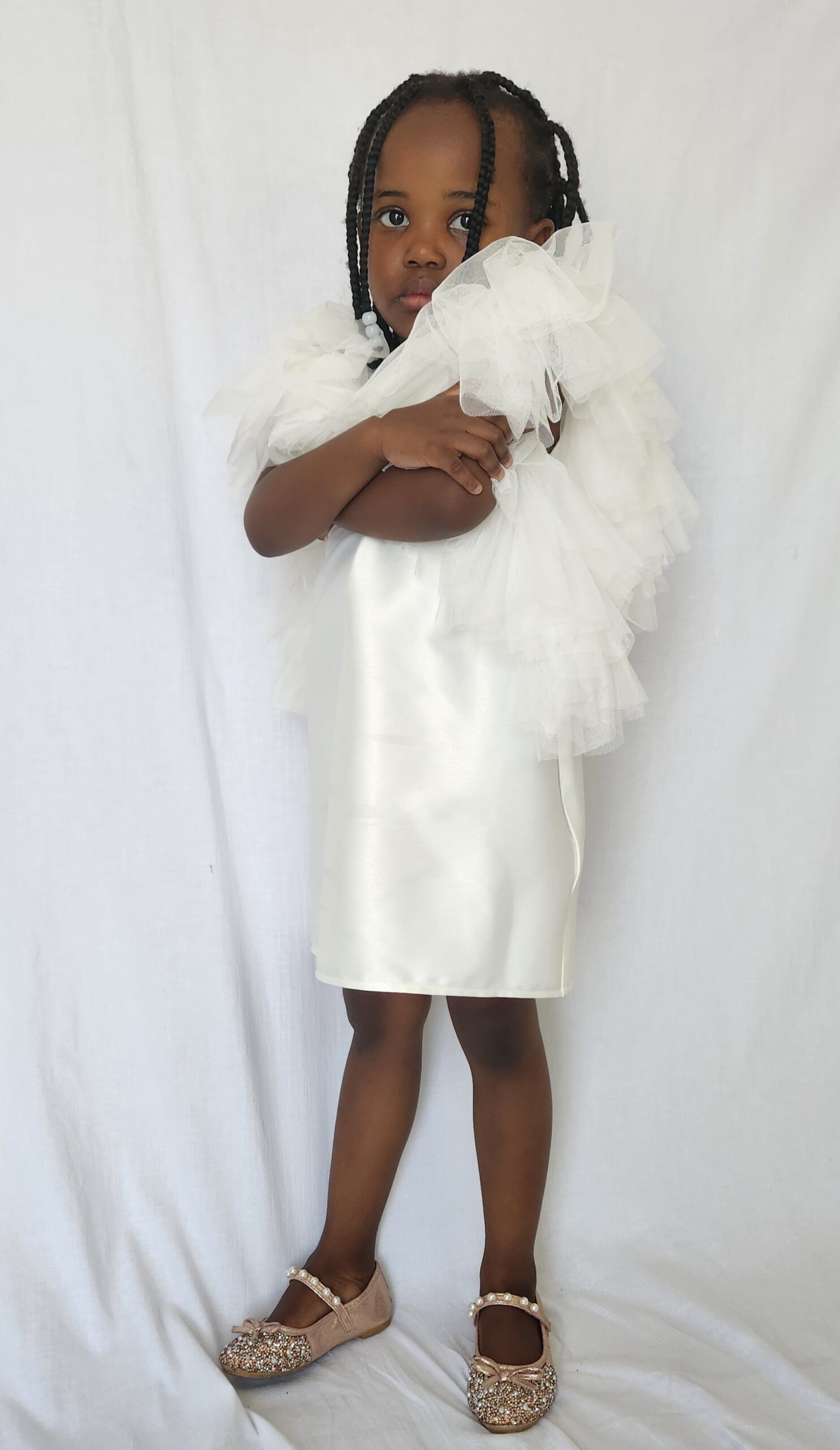 Your little princess will radiate beauty and grace in this charming satin dress, featuring tulle accents and a sweet bow detail at the back. Perfect for any special occasion, this knee-length dress will have your little girl feeling like she is in a fairy-tale. Let her shine and sparkle in this enchanting dress.